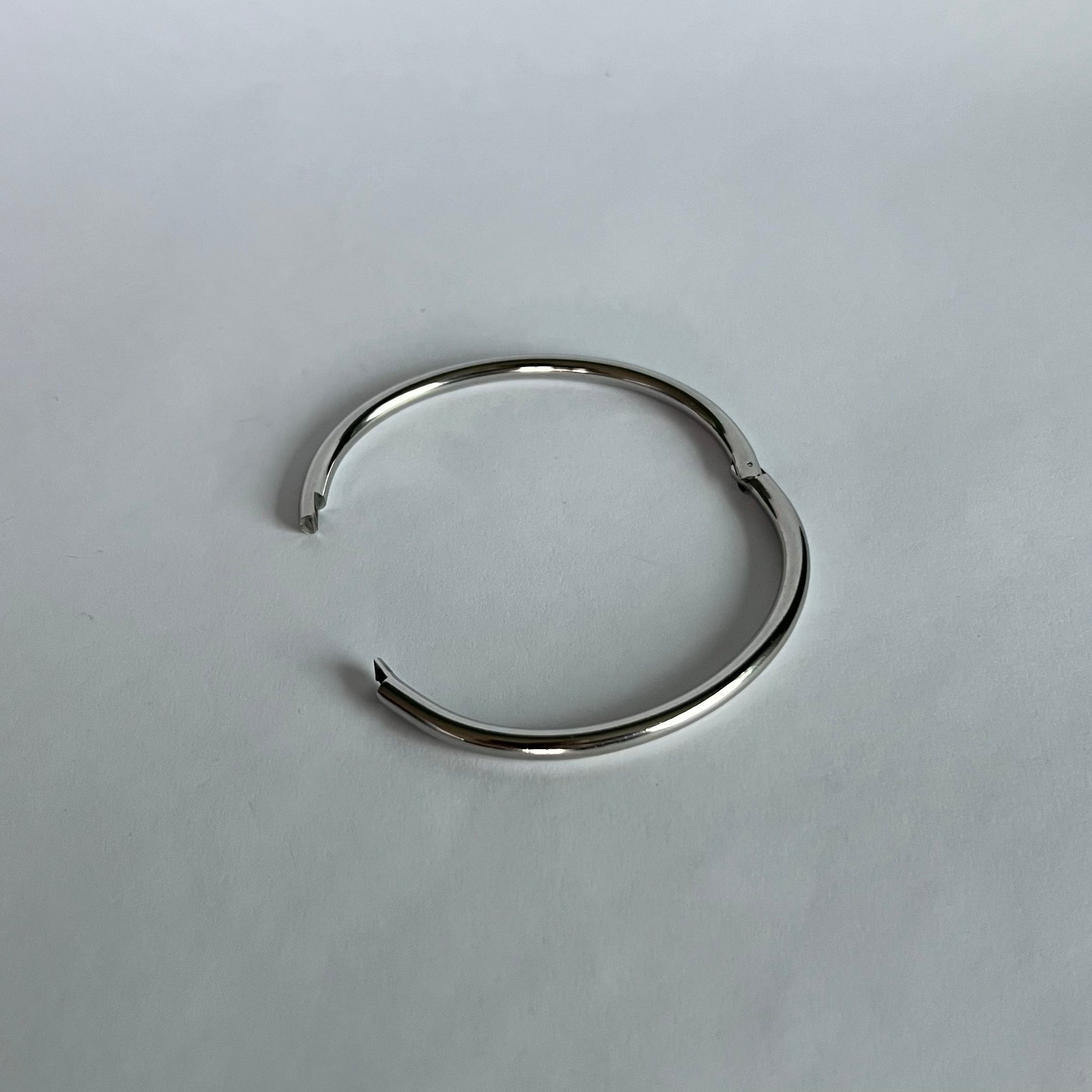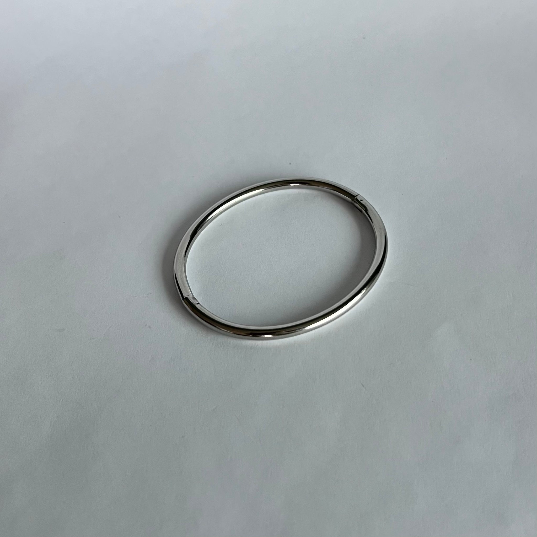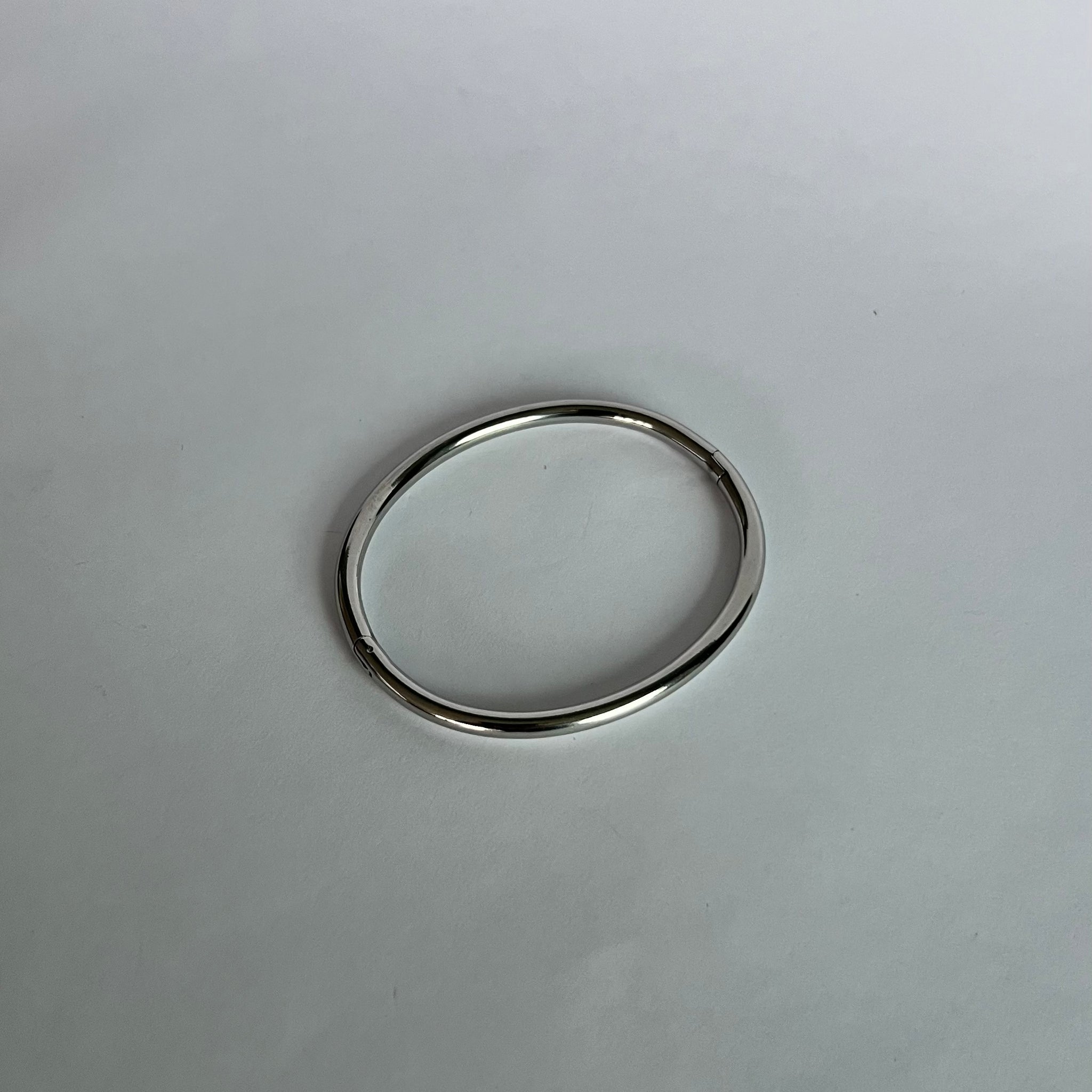 Bracelete em aço inoxidável prateado. Resistente à água, hipoalergênico e não escurece nem descasca. Não é regulável