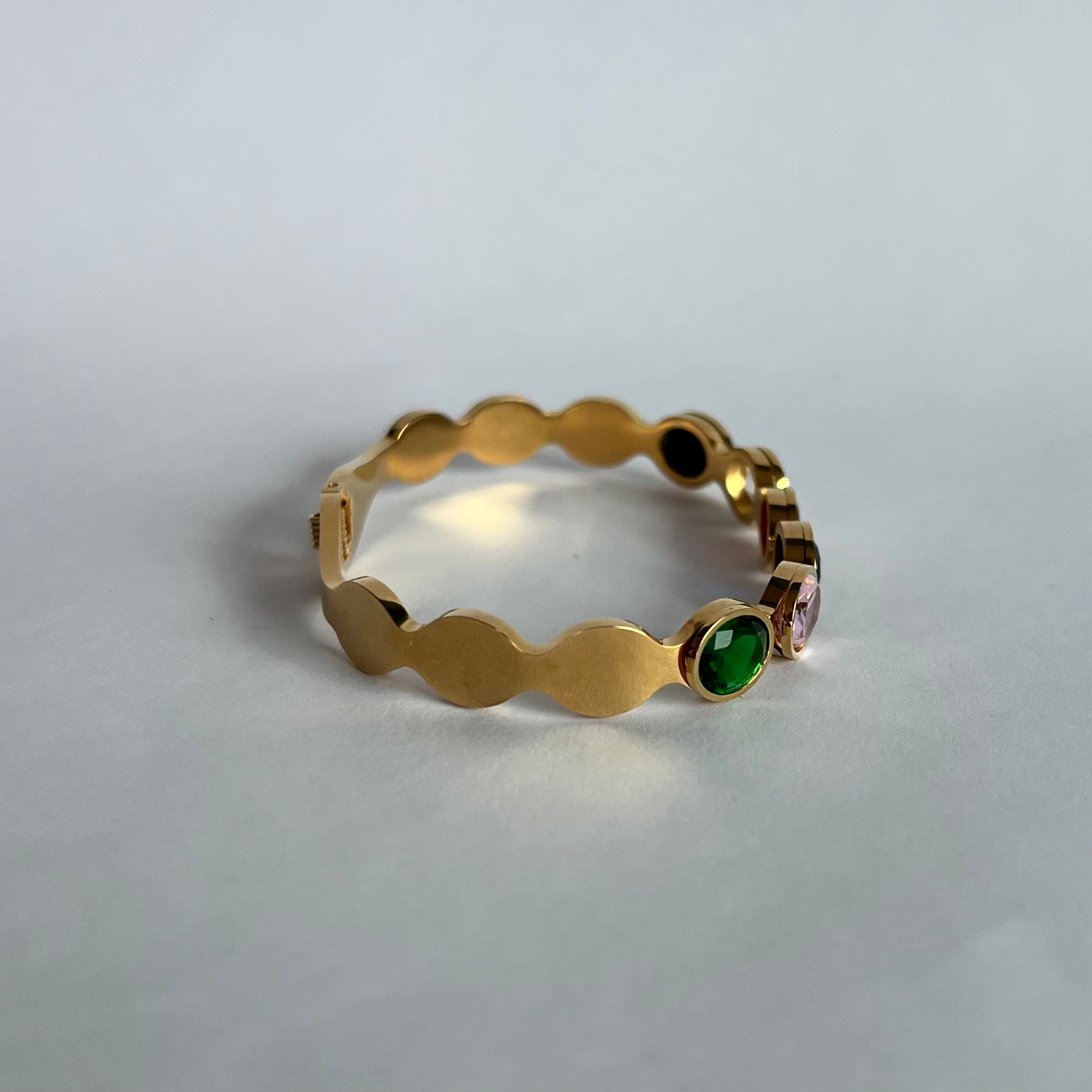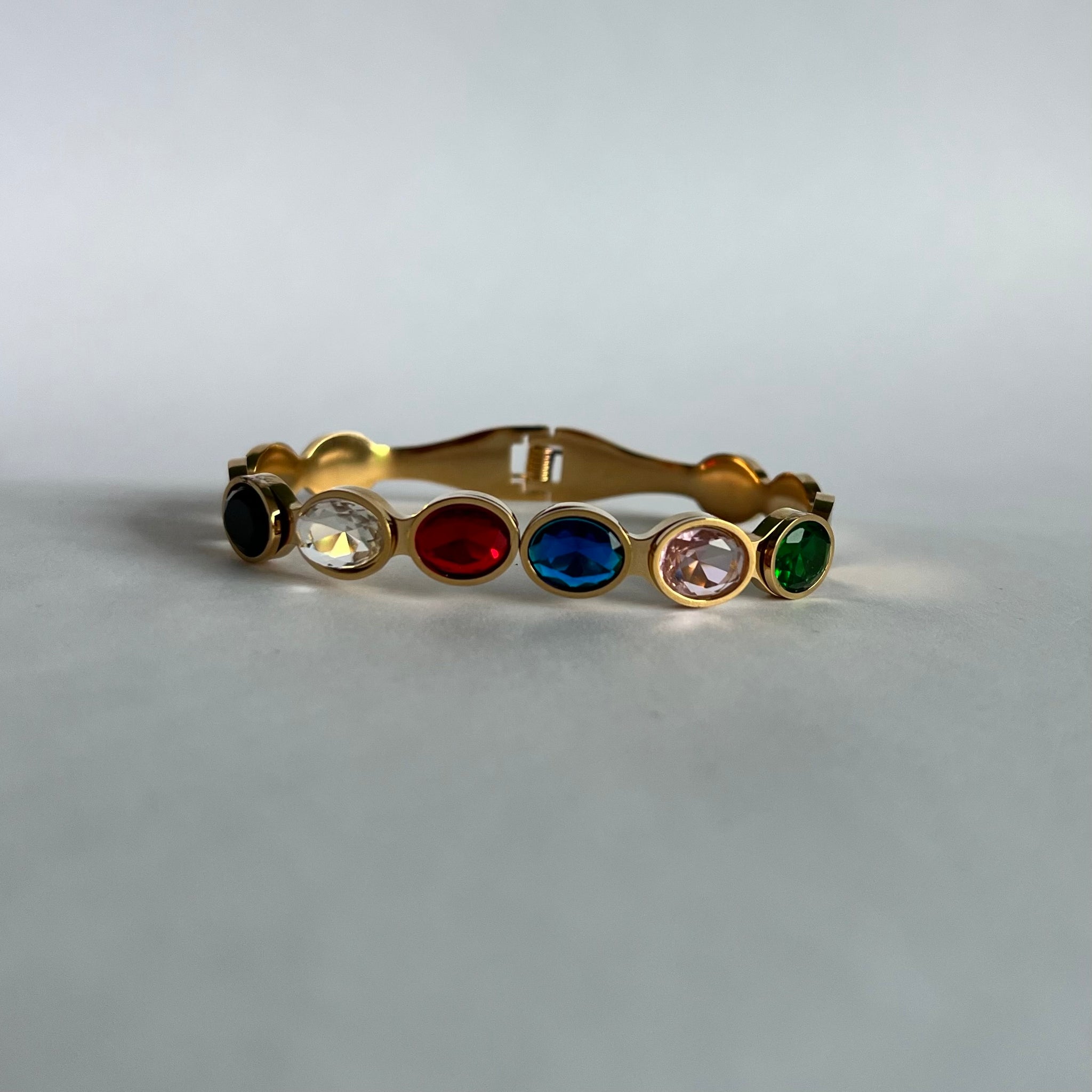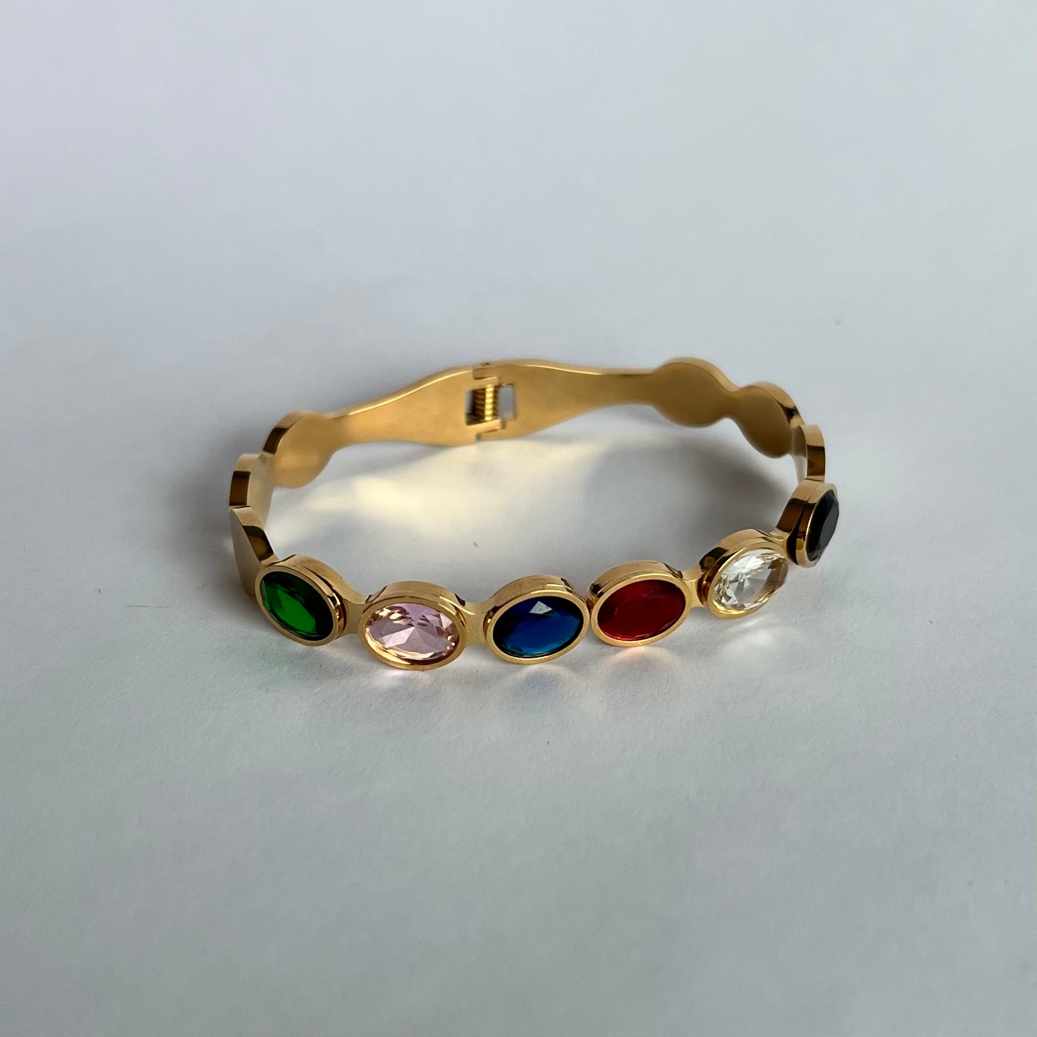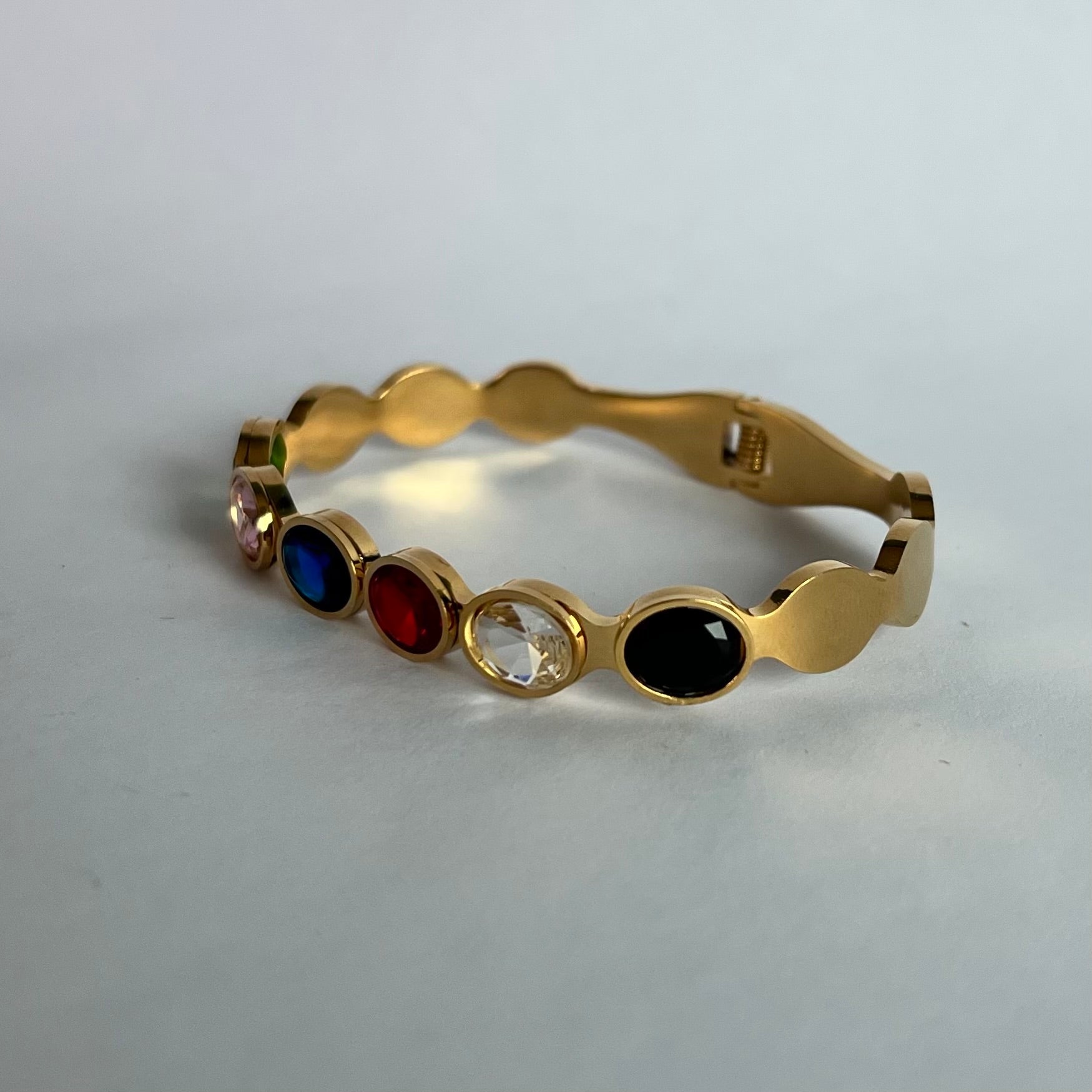 Bracelete em aço inoxidável com pedras de vidro lapidadas em várias cores. Resistente à água, hipoalergênicos e não escurece nem descasca. Não é regulável.