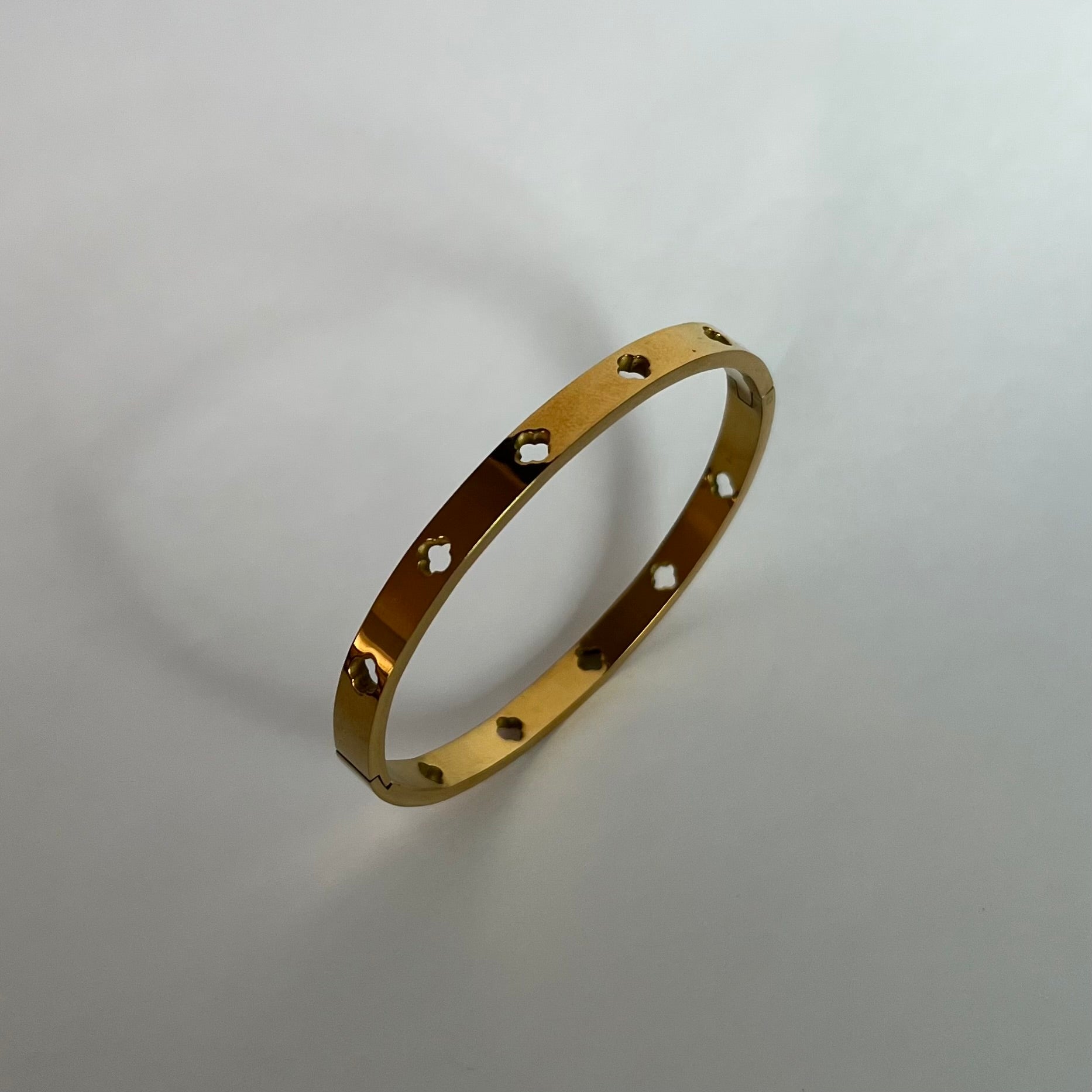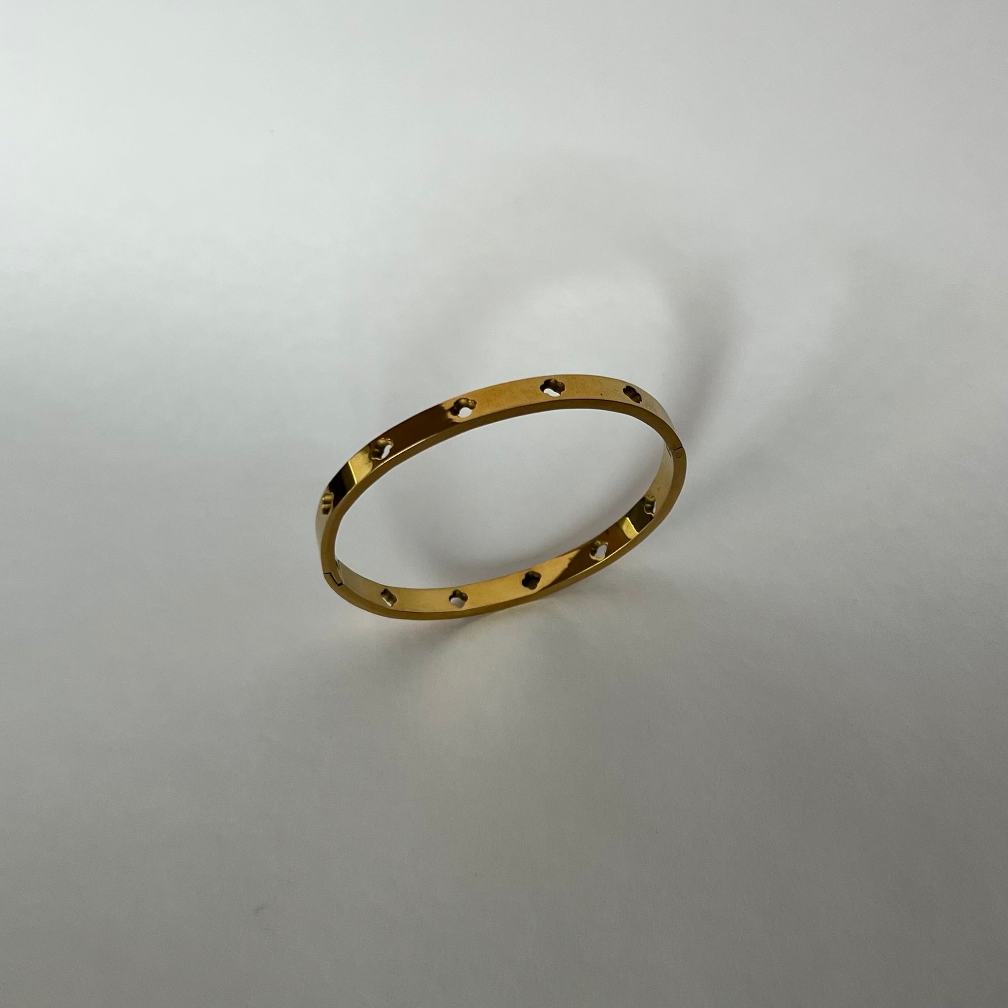 Bracelete em aço inoxidável. Resistente à água, hipoalergênico e não escurece nem descasca. Não é regulável.
