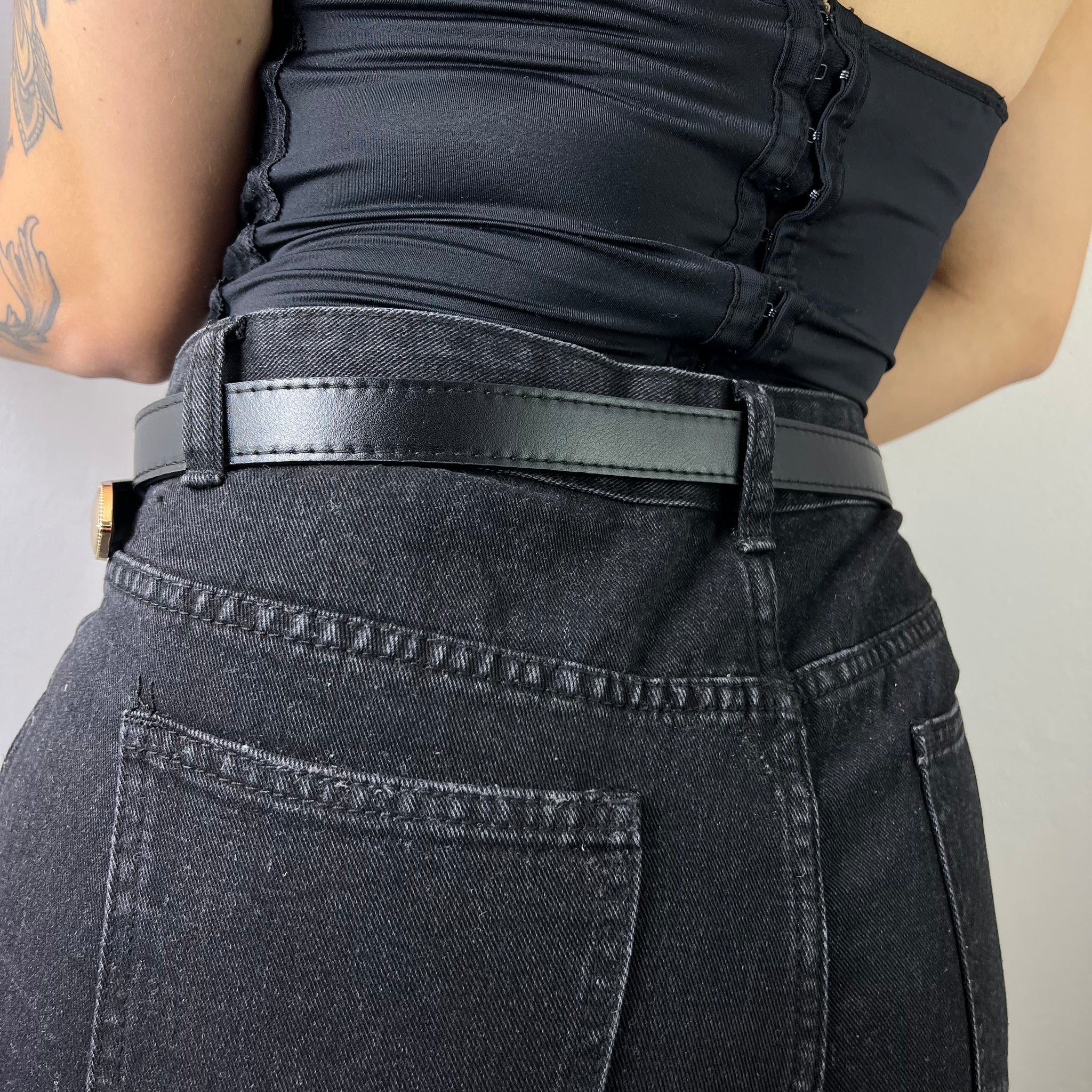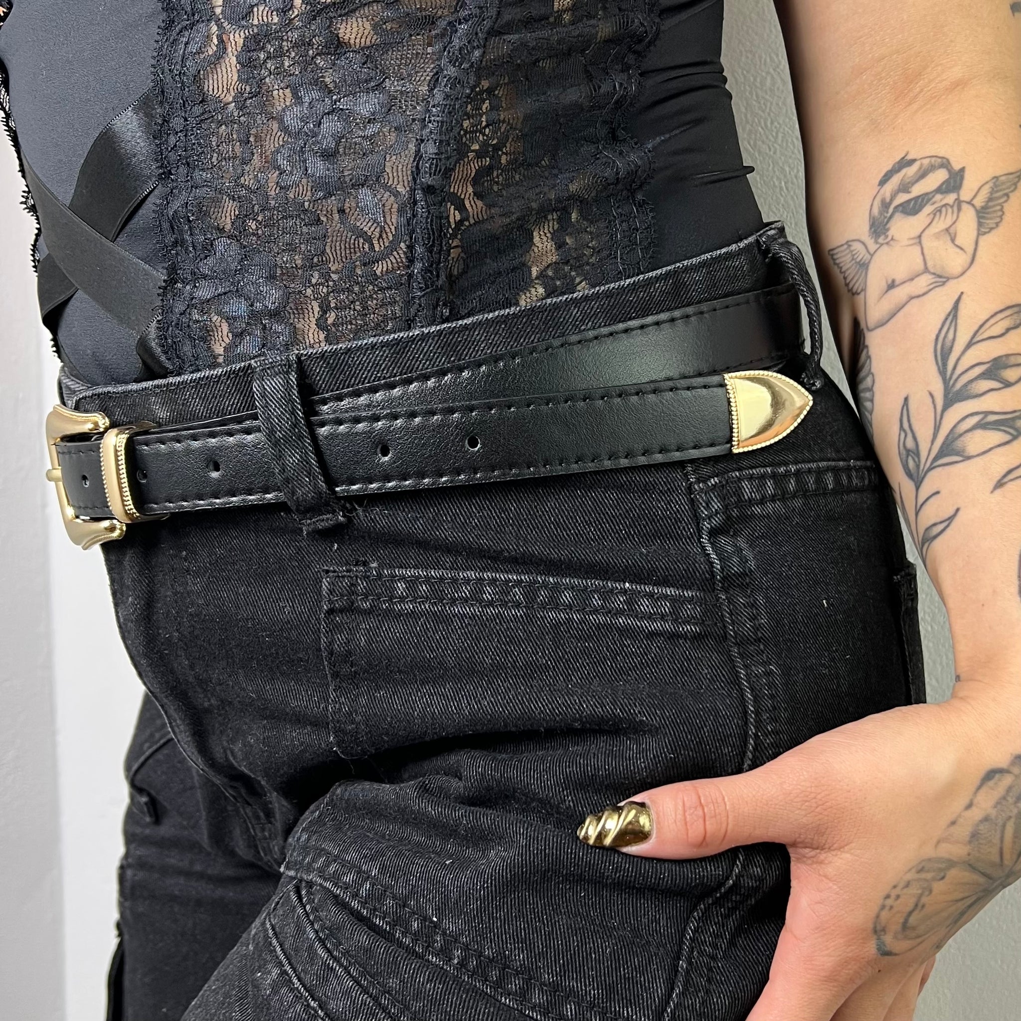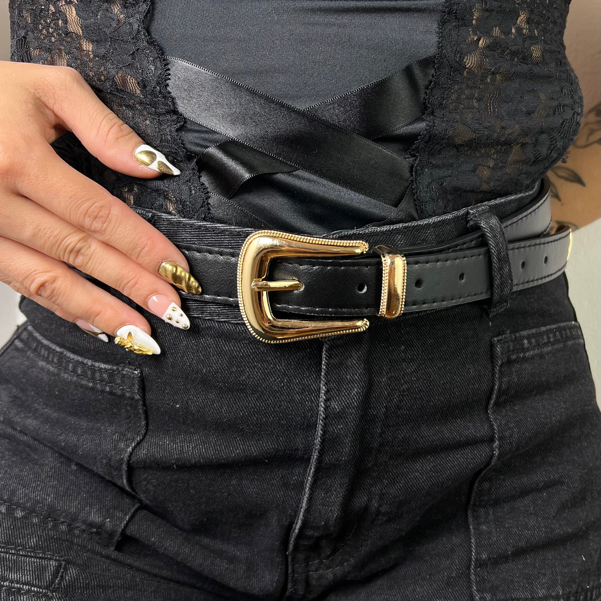 Cinto em material couro sintético, com fivela metálica dourada. Ajustável e resistente.