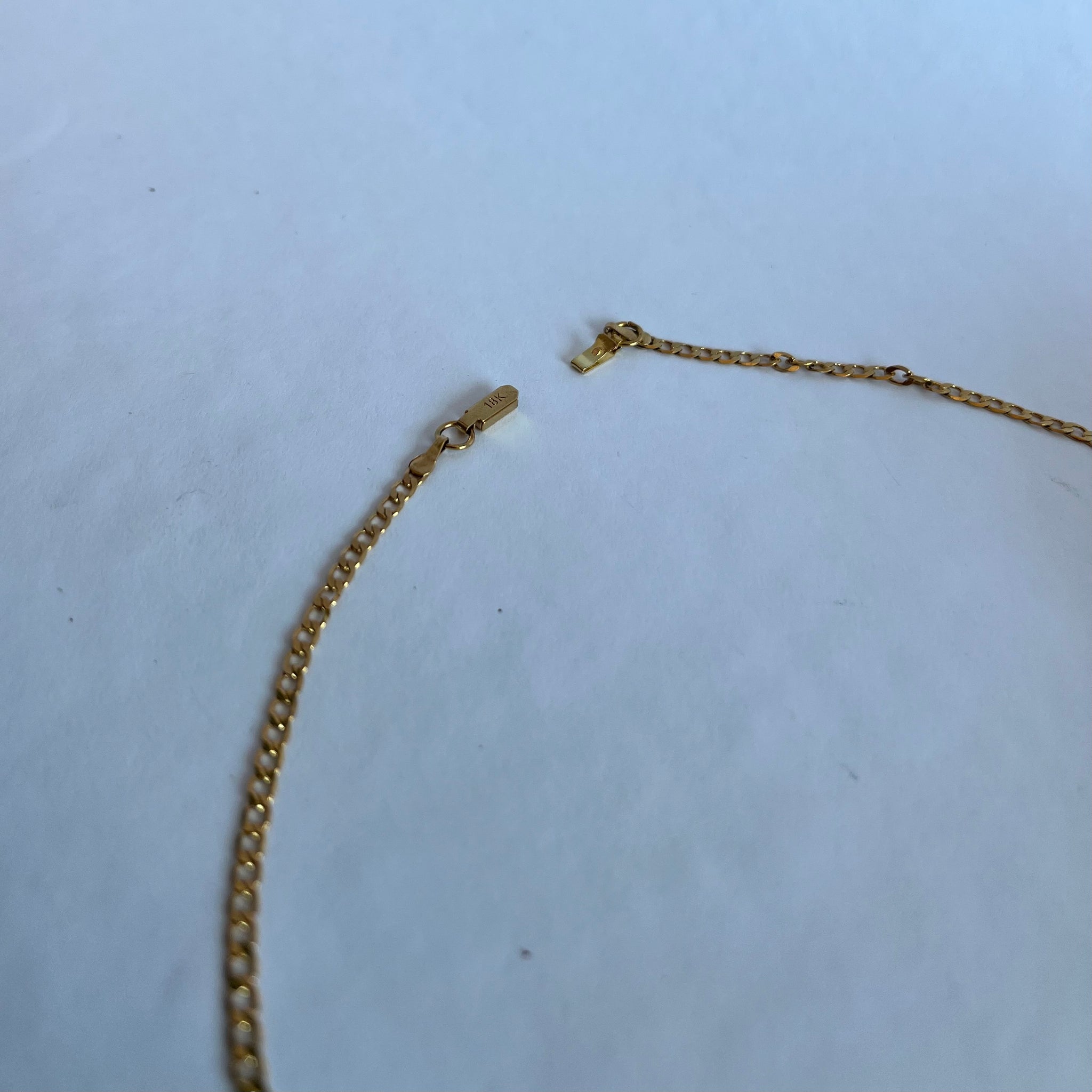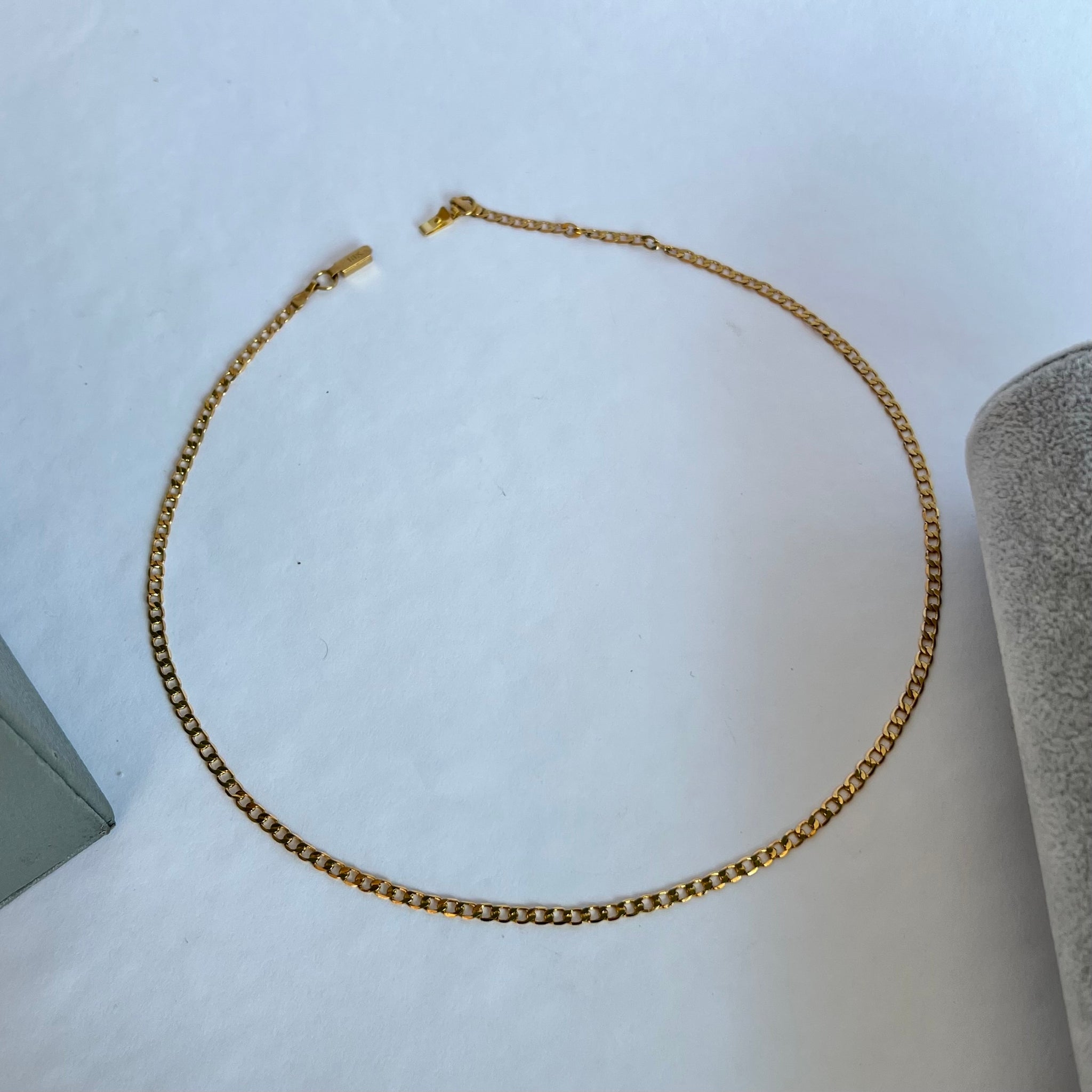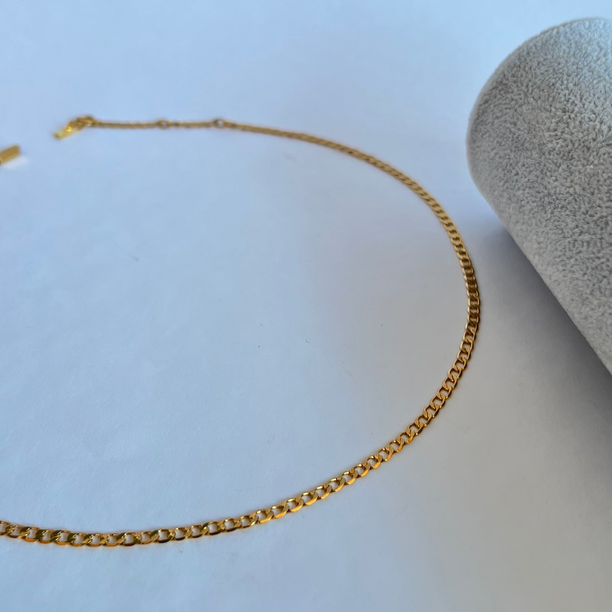 Colar em aço inoxidável. Resistente à água, hipoalergênico e não escurece nem descasca. Não é regulável.