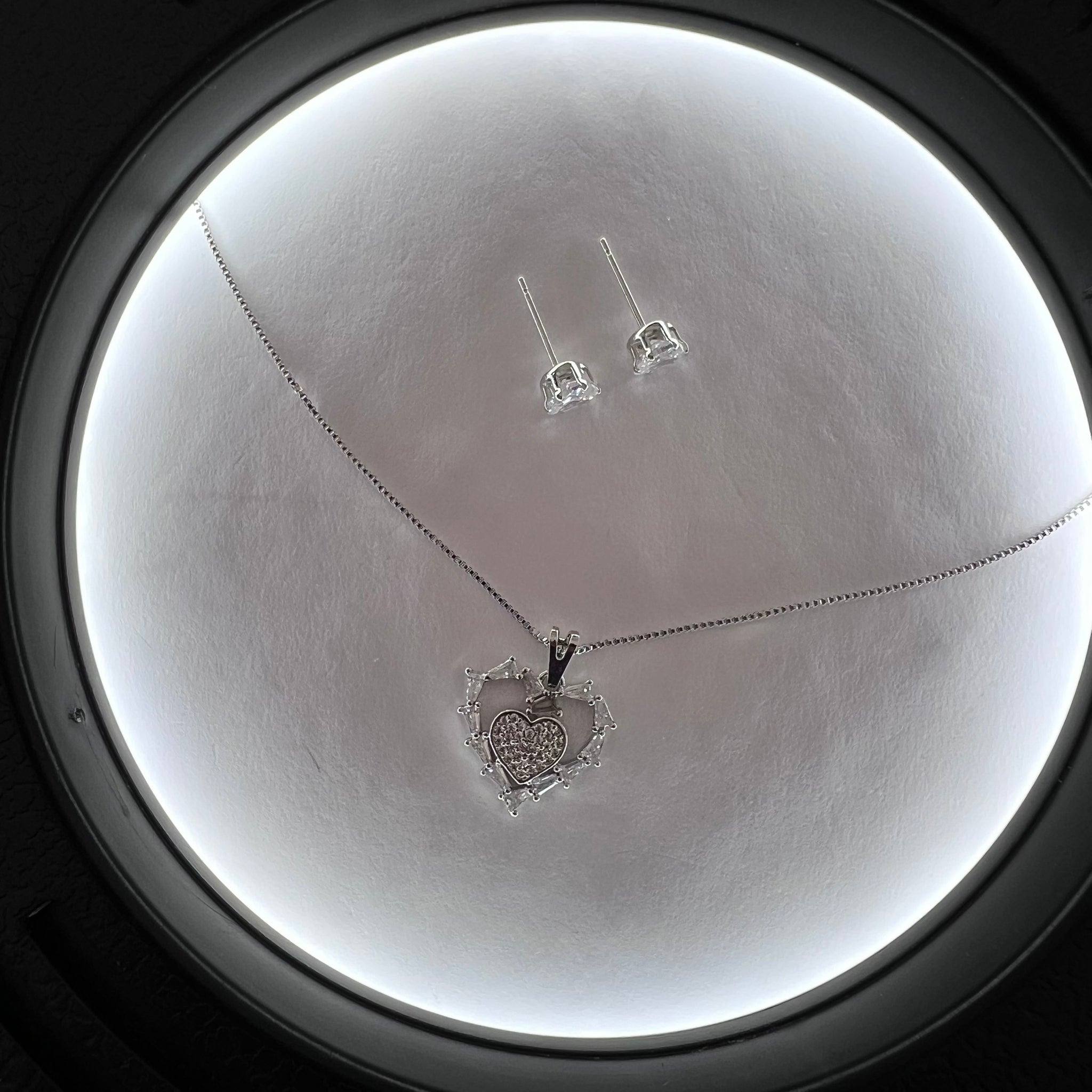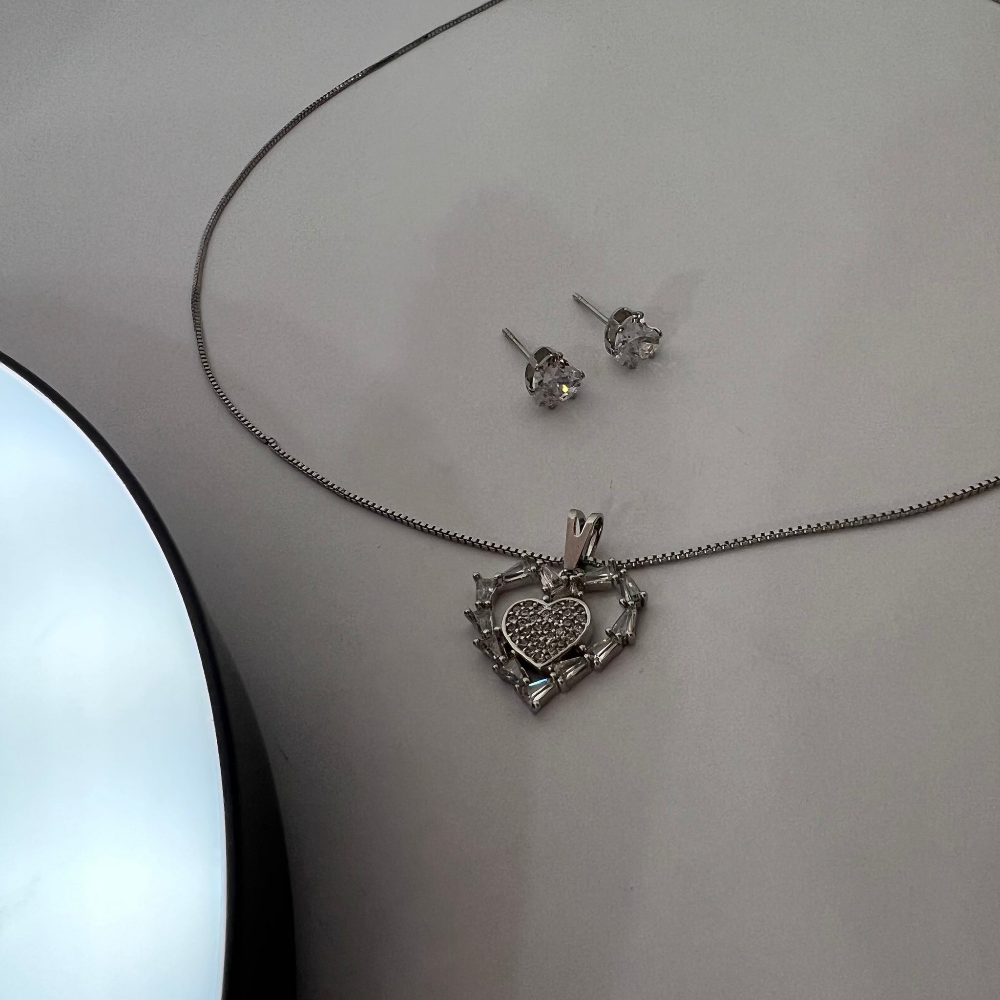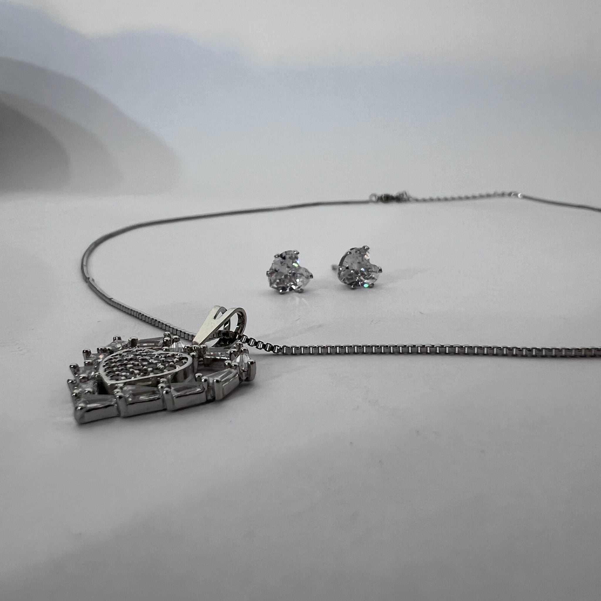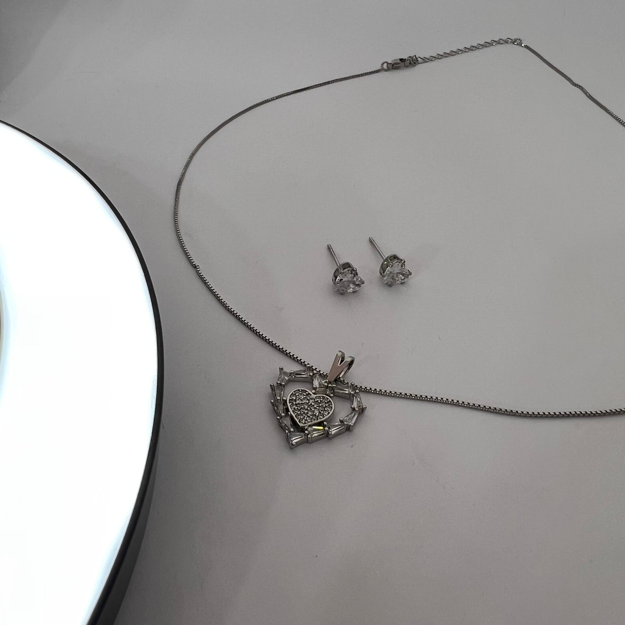 Conjunto de brinco e colar folheados. Colar prateado com pedras de zircônia, Brinco com pedra de zircônia folheado.