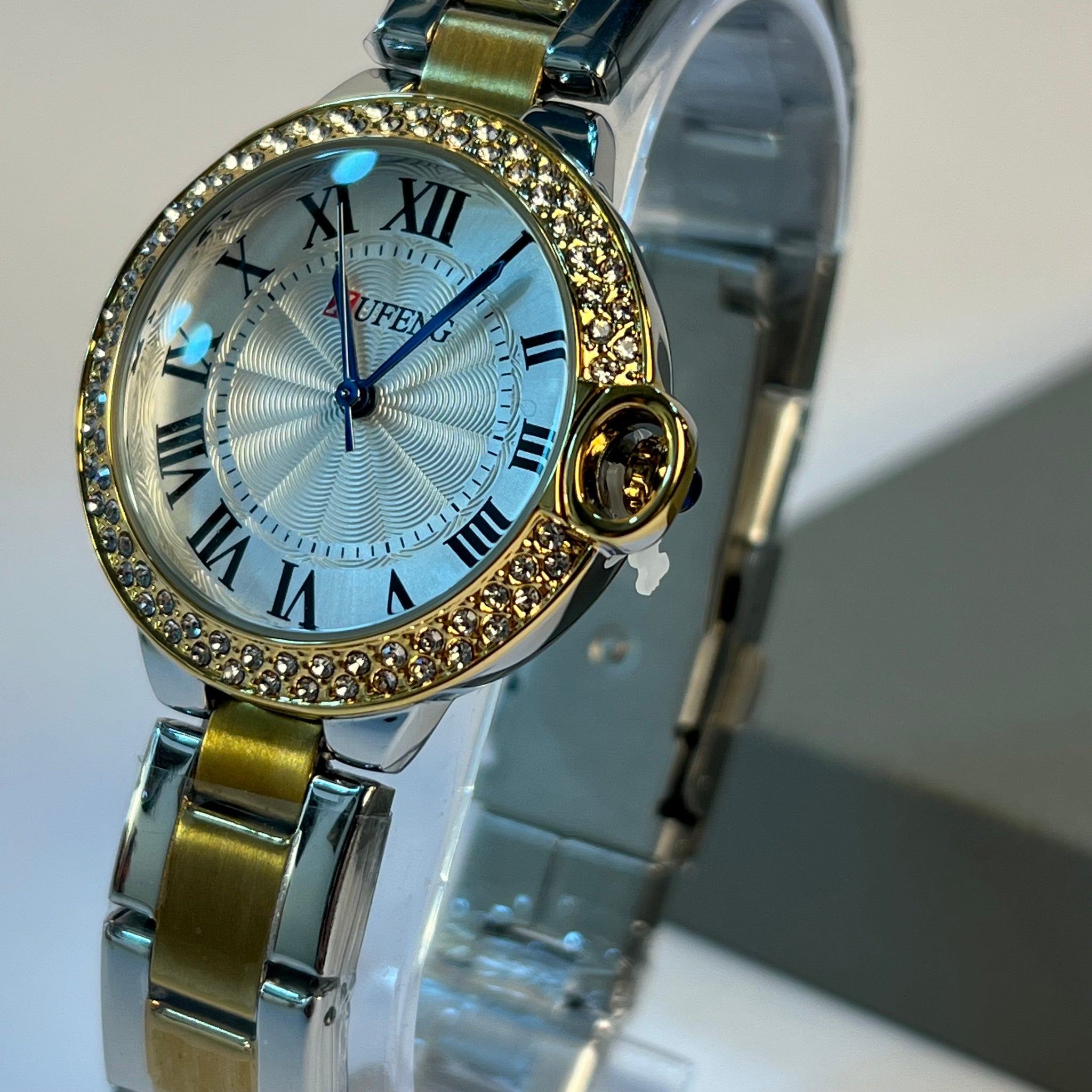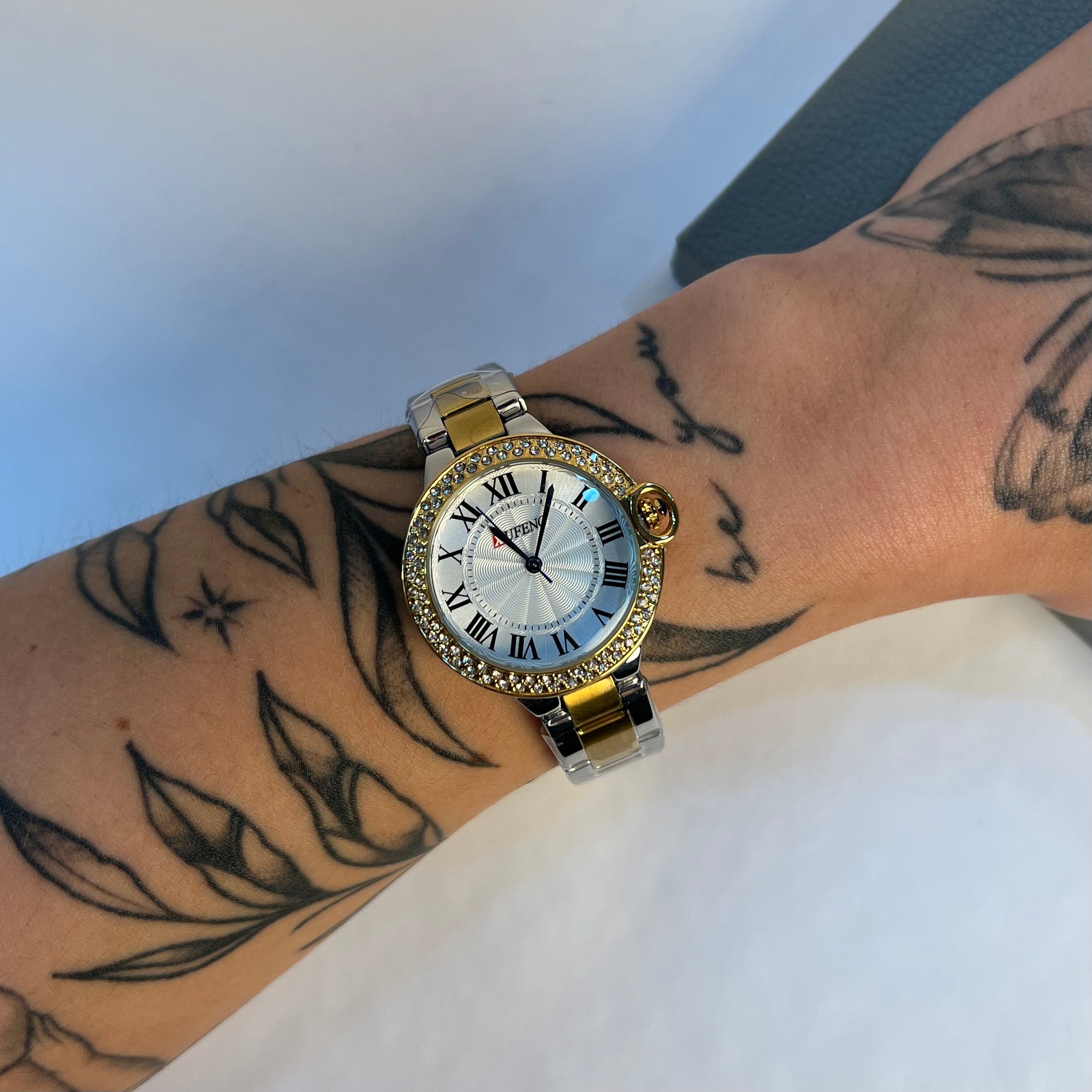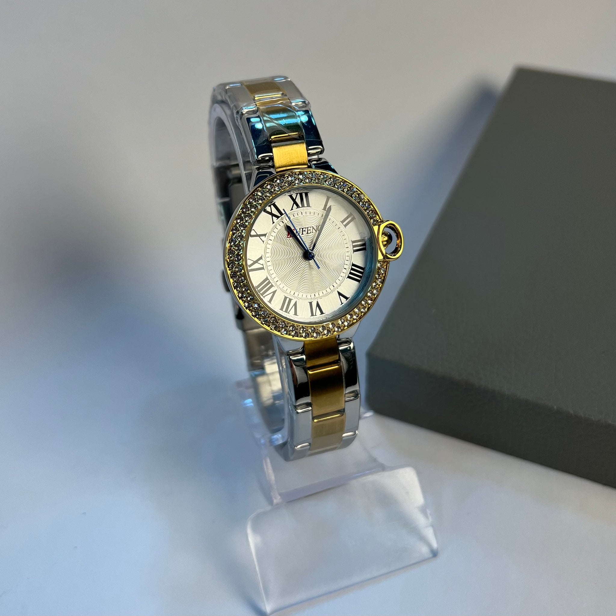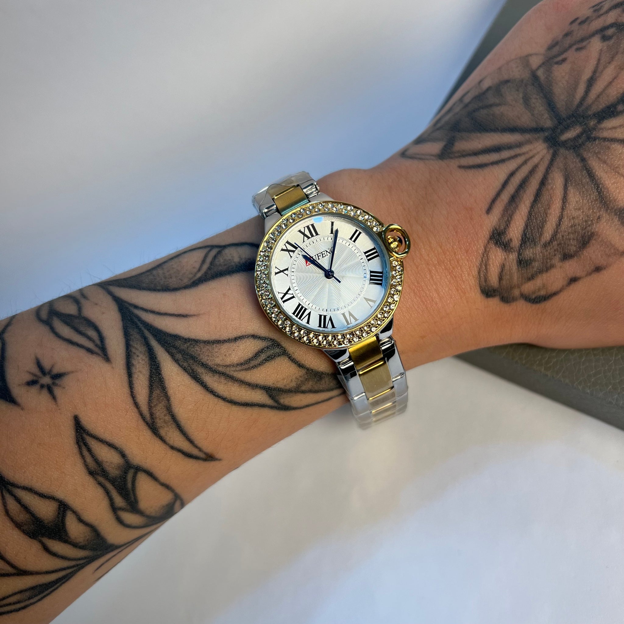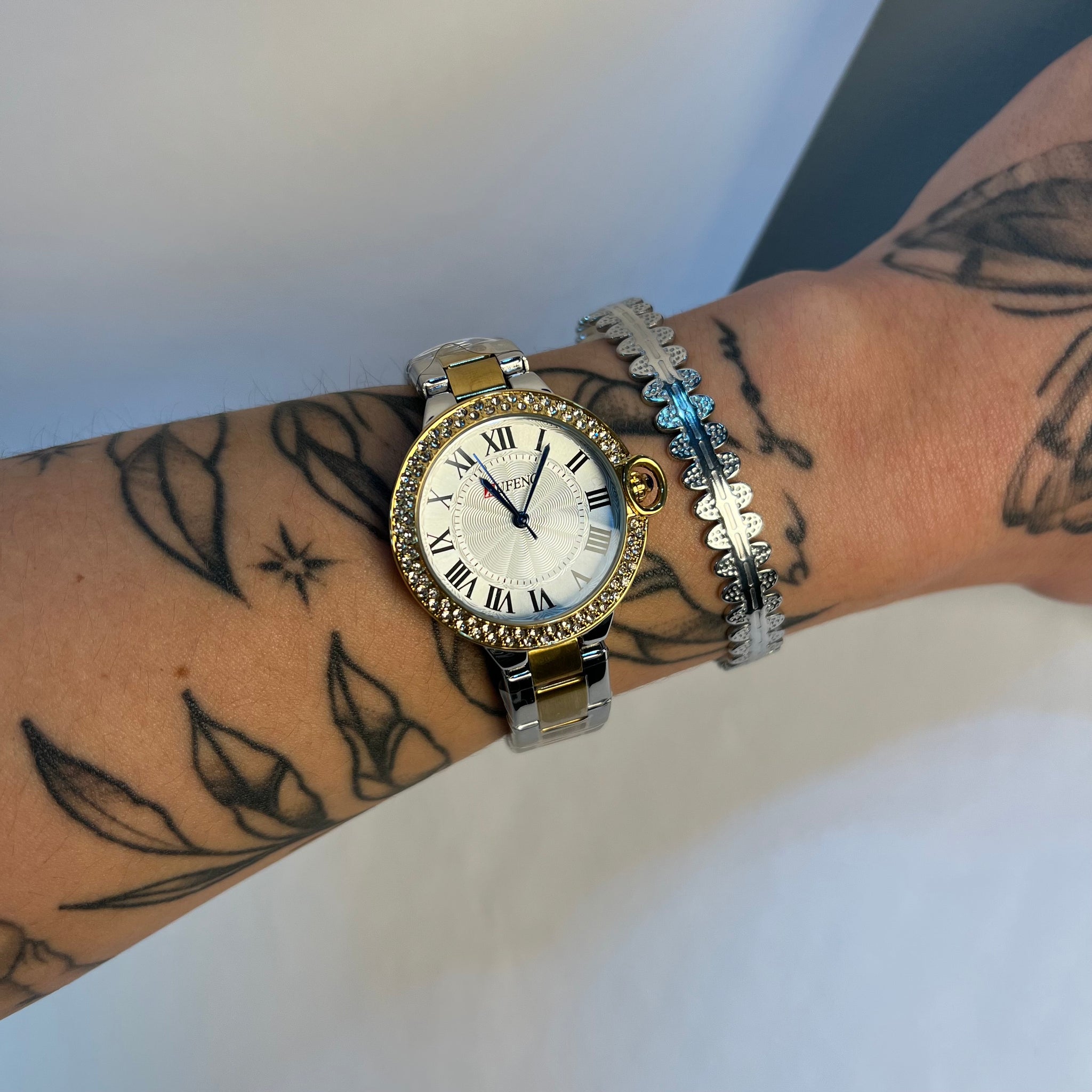 Relógio Retrô - dourado/prateado Cravejado com Pedras em Zircônia e Pulseira de elos reguláveis