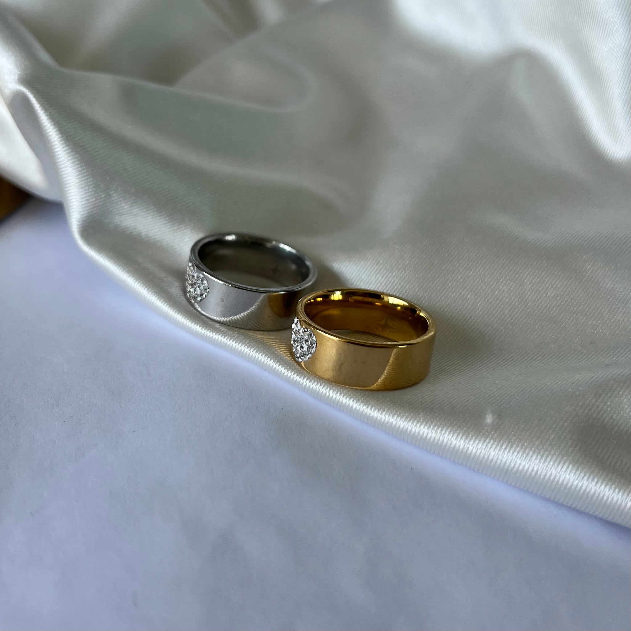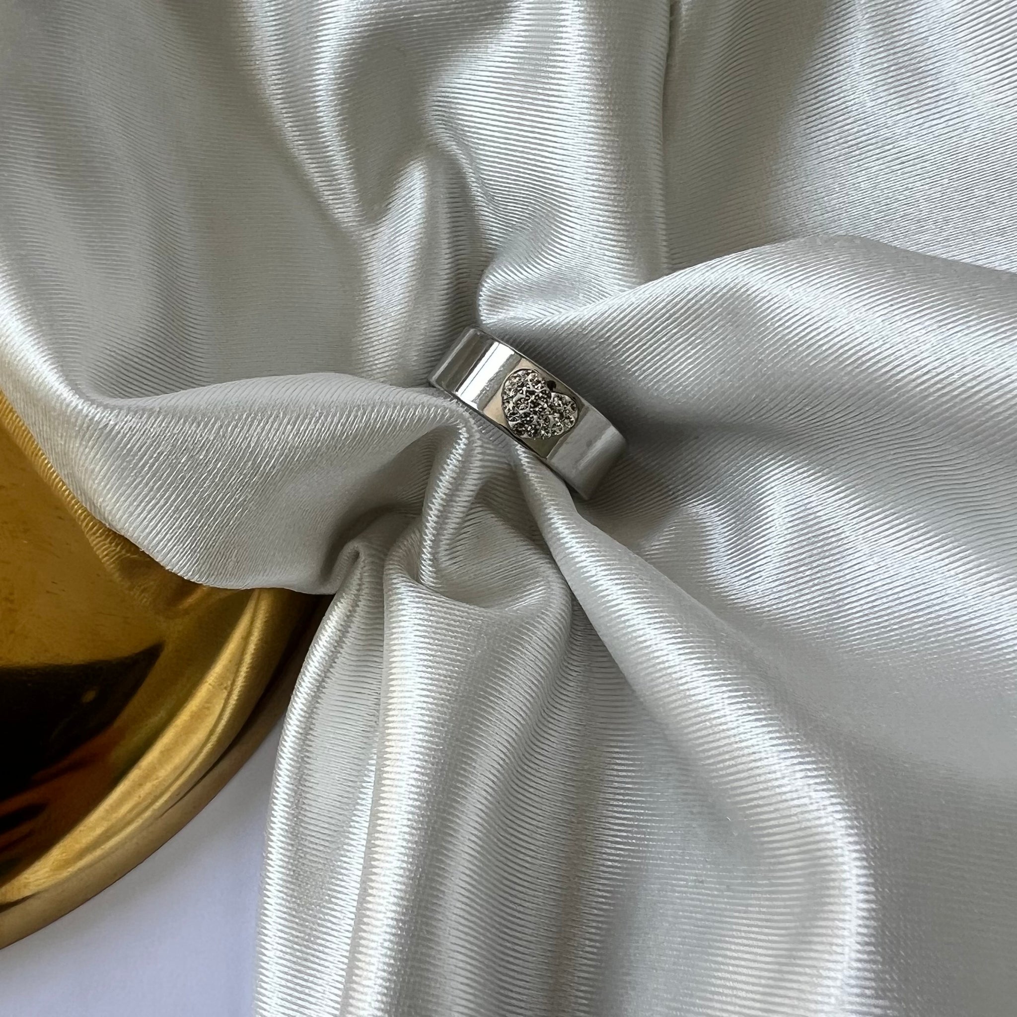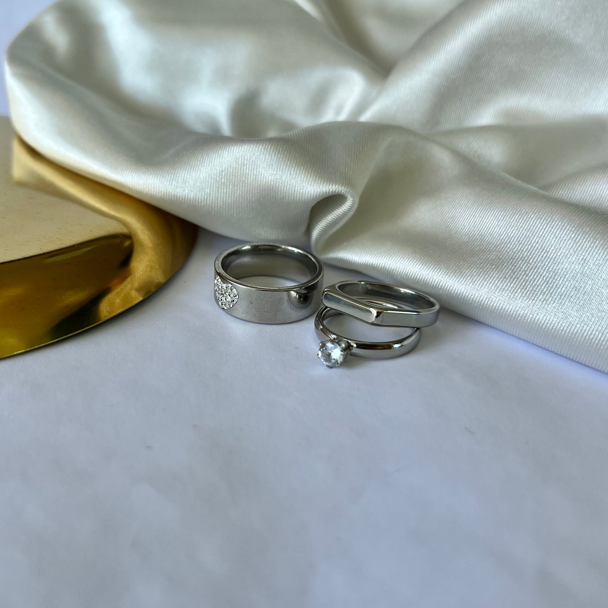 Anel em aço inoxidável. Com pedras em zircônia. Resistente à água, hipoalergênicos e não escurece nem descasca.