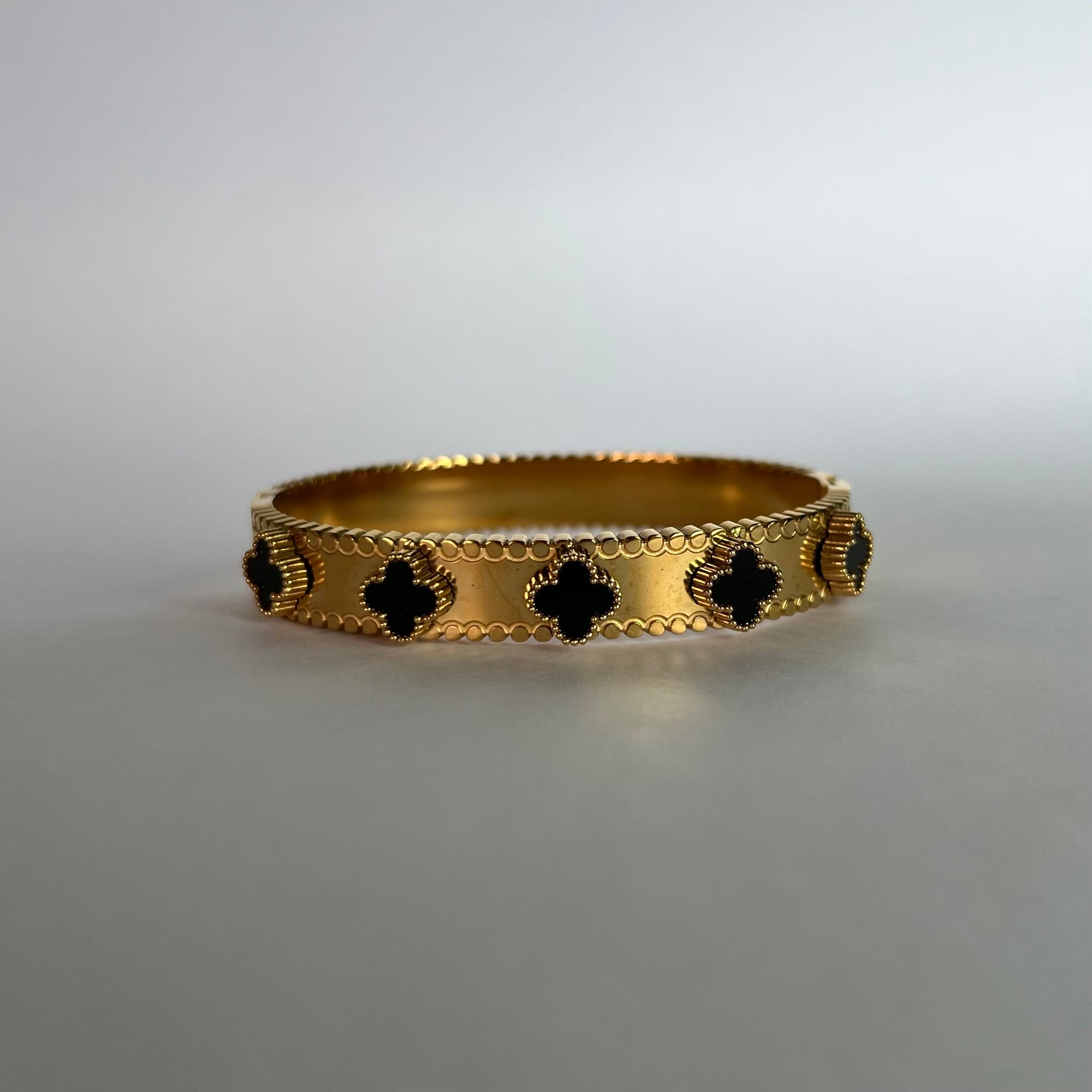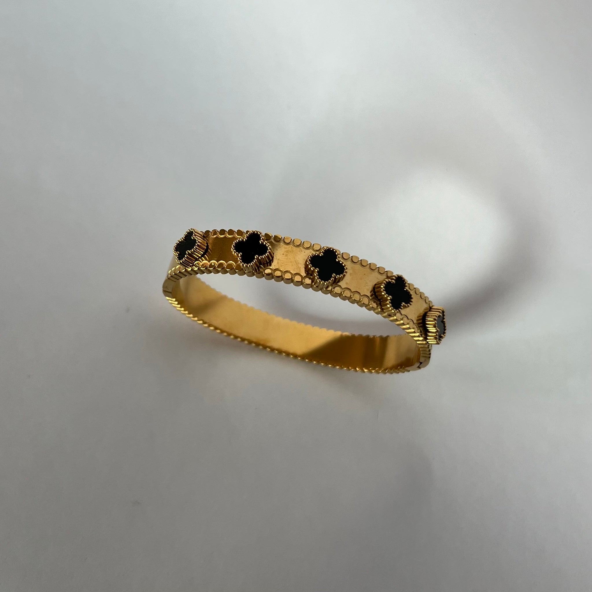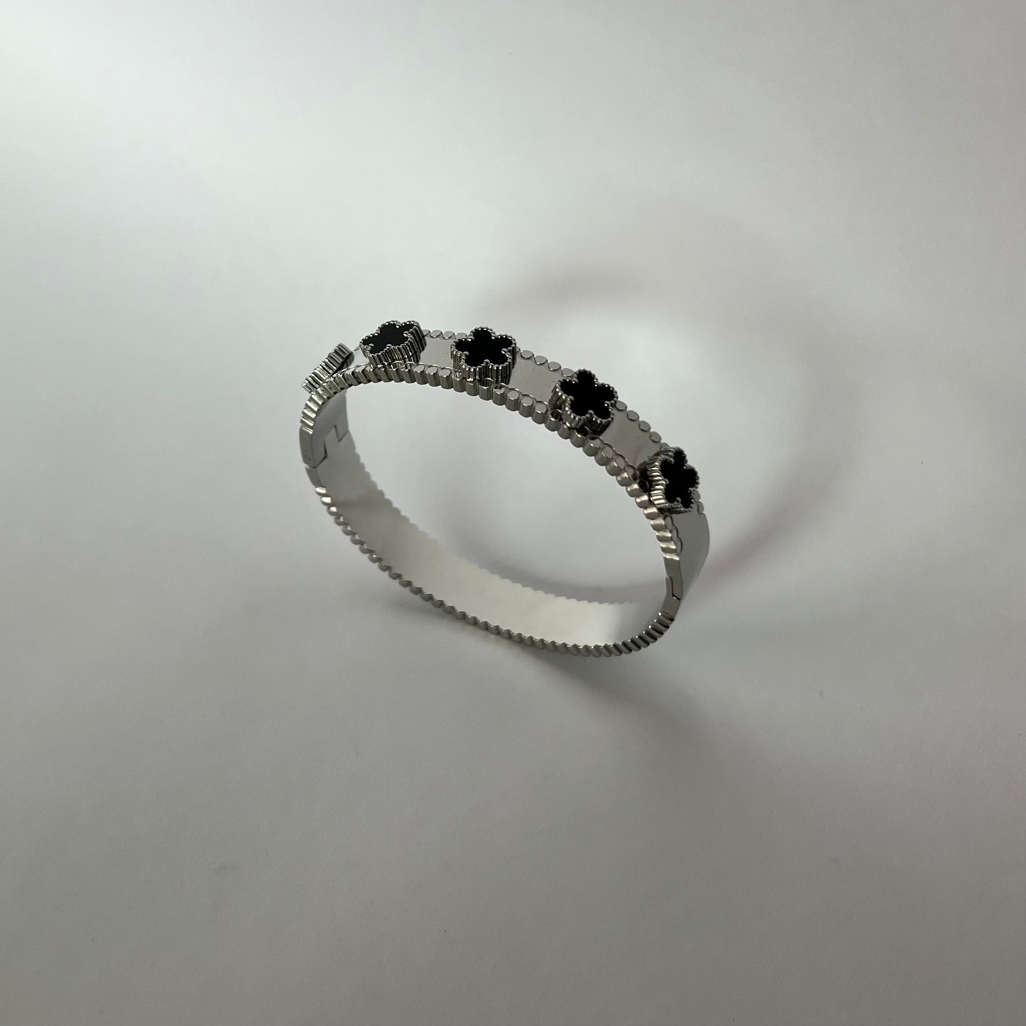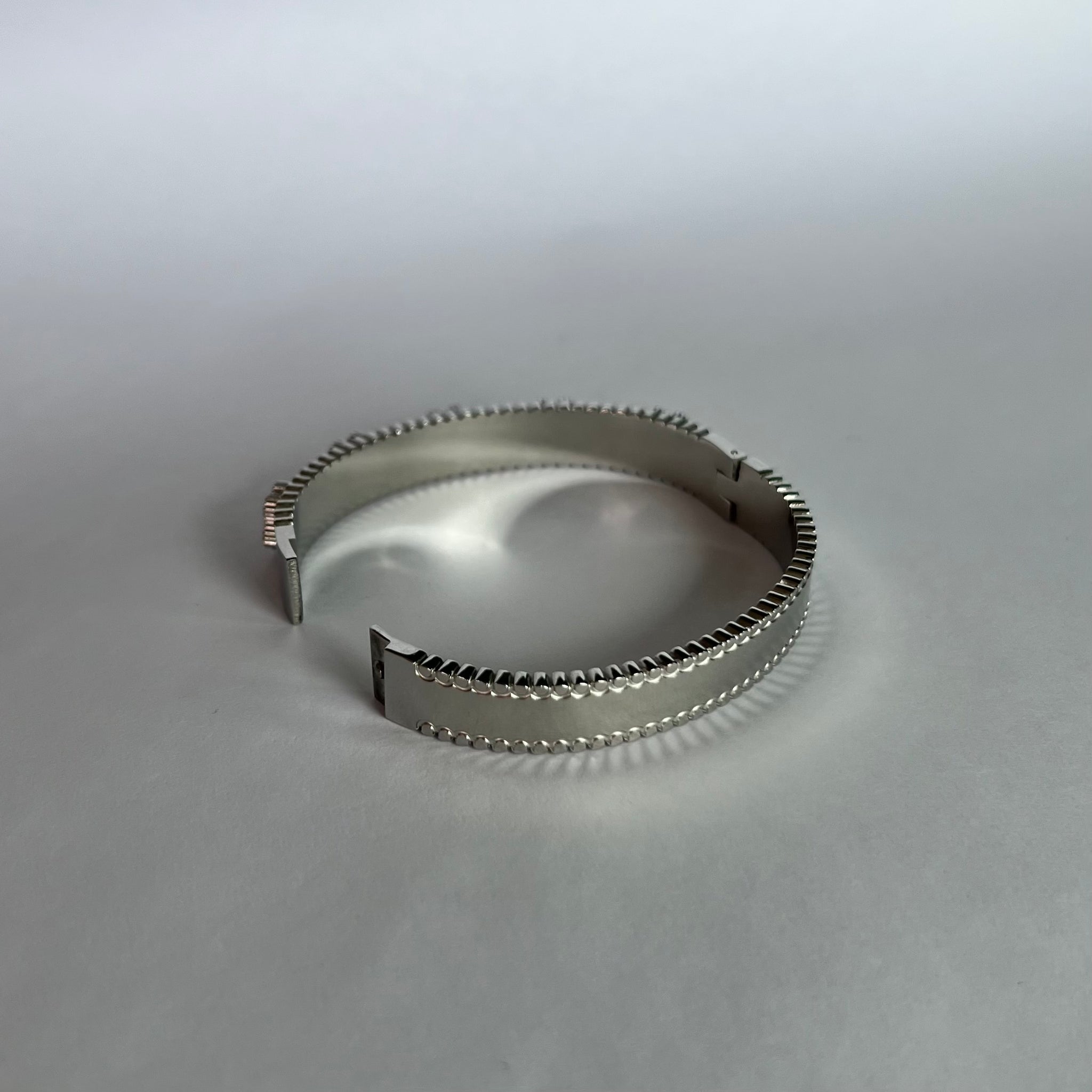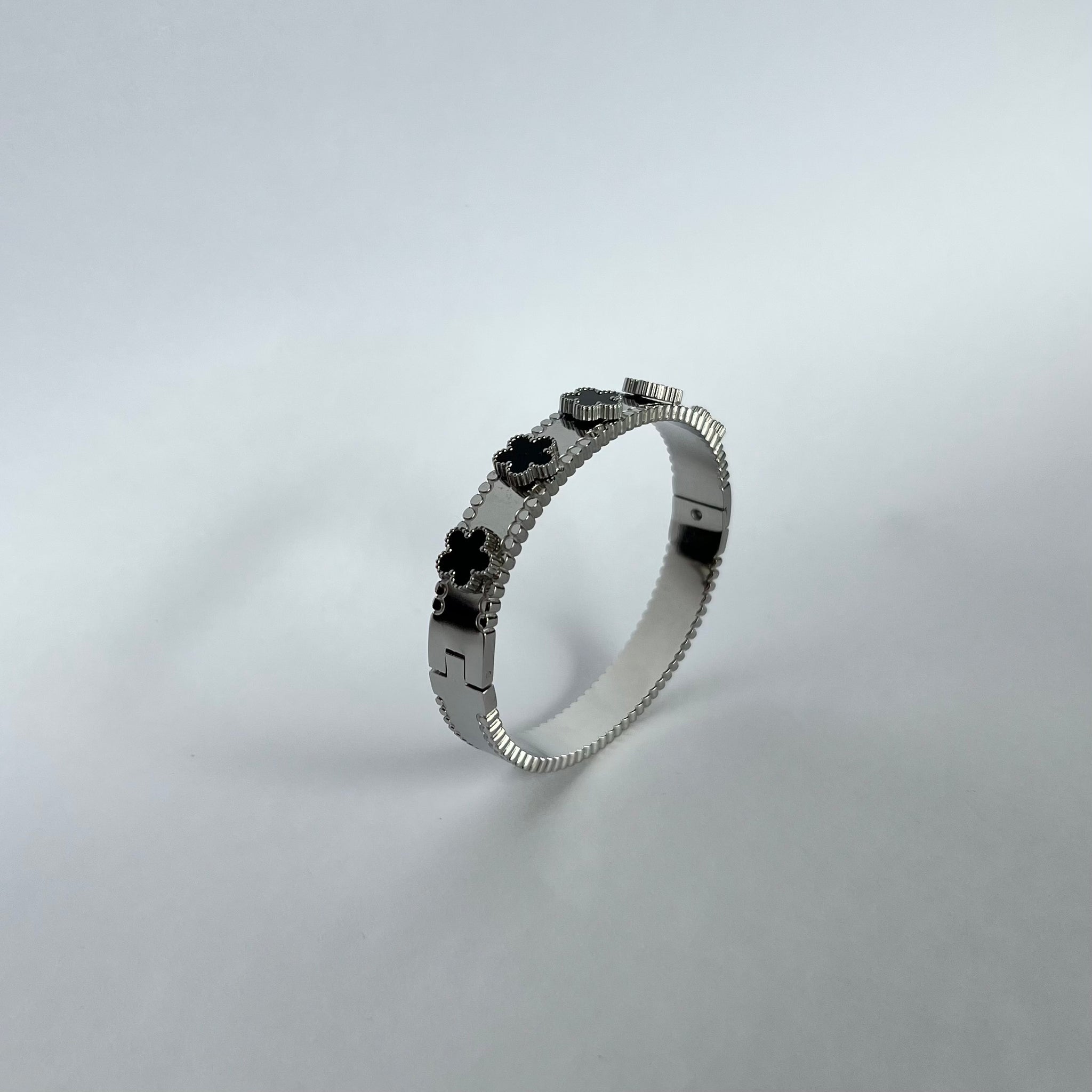 Bracelete em aço inoxidável. Resistente à água, hipoalergênicos e não escurece nem descasca. Não é regulável.