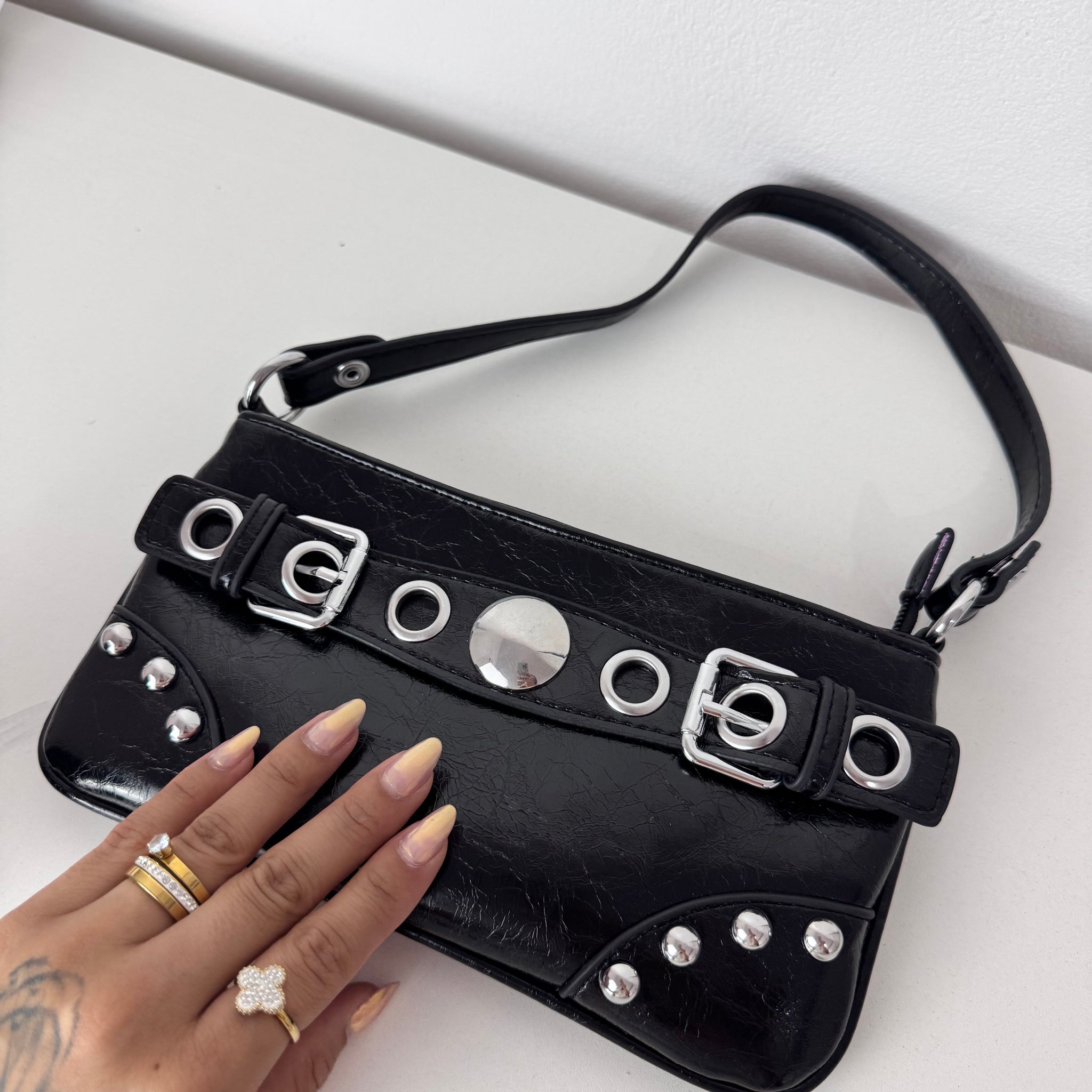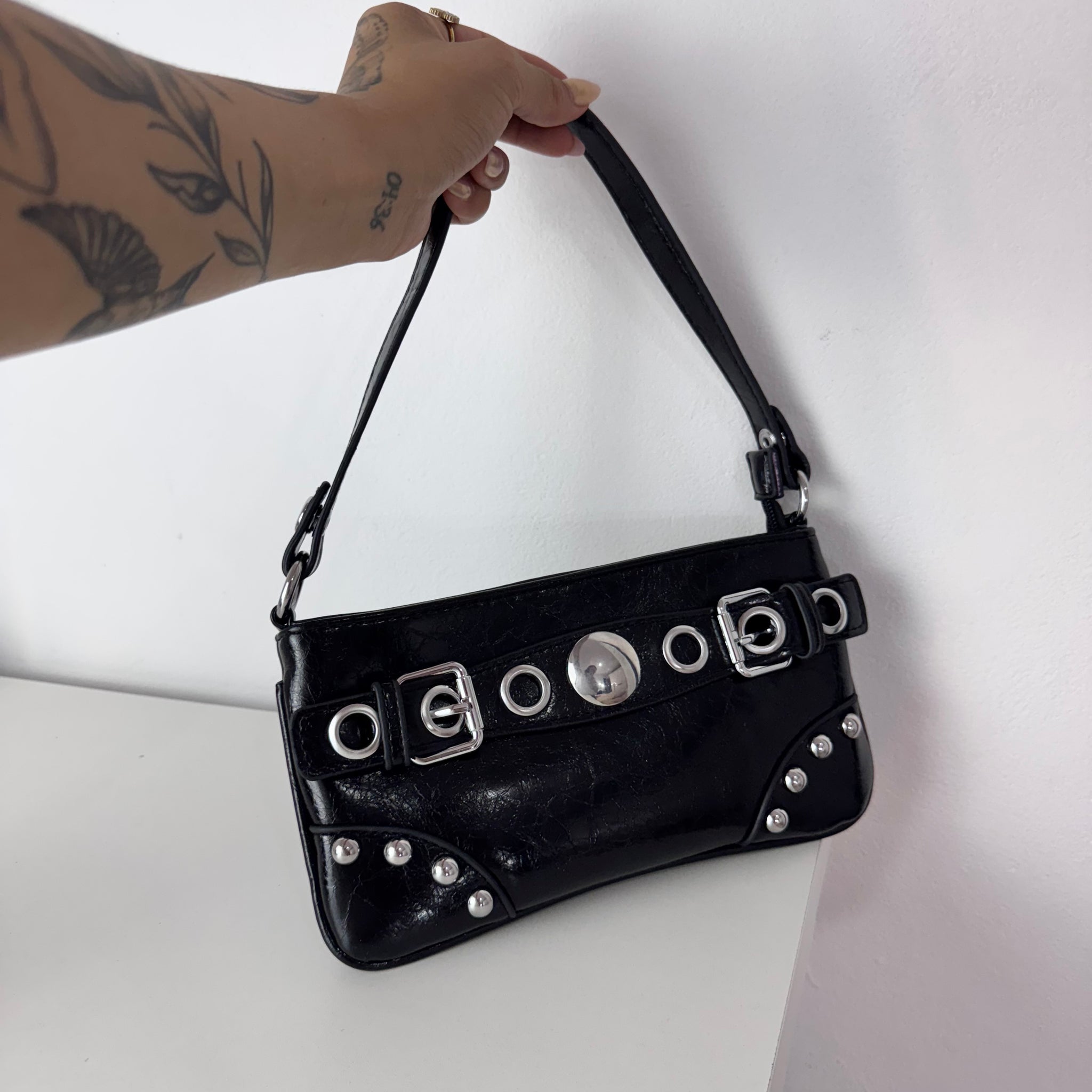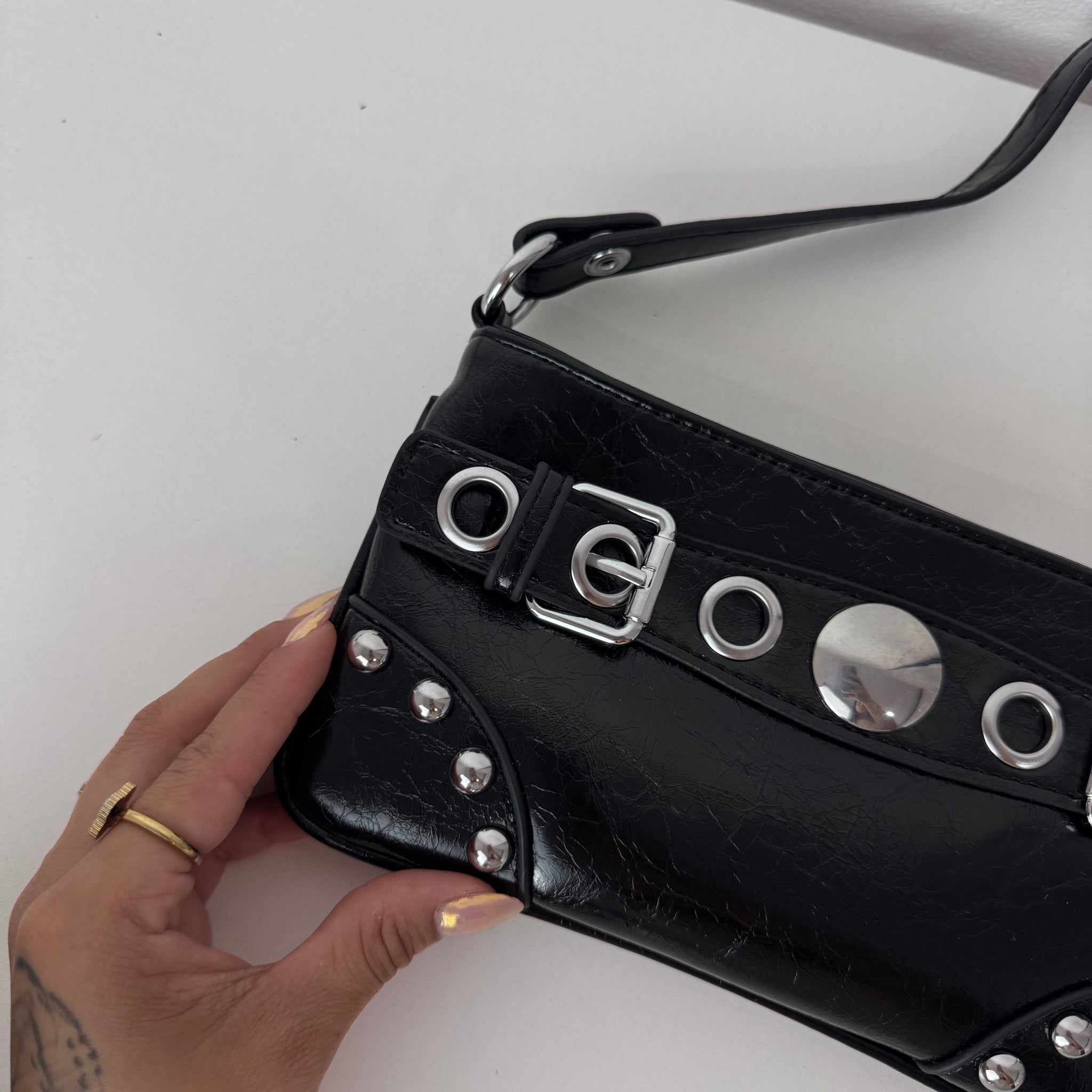 Bolsa Preta com detalhes prata, acompanha duas alças.